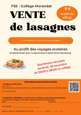Par CHRISTELLE GEROME, publié le jeudi 7 novembre 2024 18:26 - Mis à jour le vendredi 7 novembre 2025 09:32Une vente de lasagnes est organisée par le FSE au profit des voyages scolaires. -