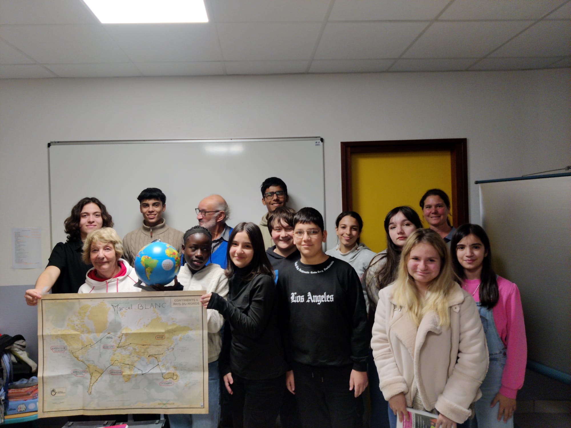 Le 20 novembre 2025, la classe de FLE a reçu la visite de Marcel BLANC, un homme qui a fait le tour du monde à vélo. Il a visité 51 pays et 5 continents. Il est parti de chez lui le 4 mai 1986. Son voyage a duré 3,5 ans. Aujourd'hui, Marcel BLANC a 80 ans. Il avait 41 ans quand il est parti. Il est venu nous raconter son voyage et nous montrer les belles photos qu'il avait prises.