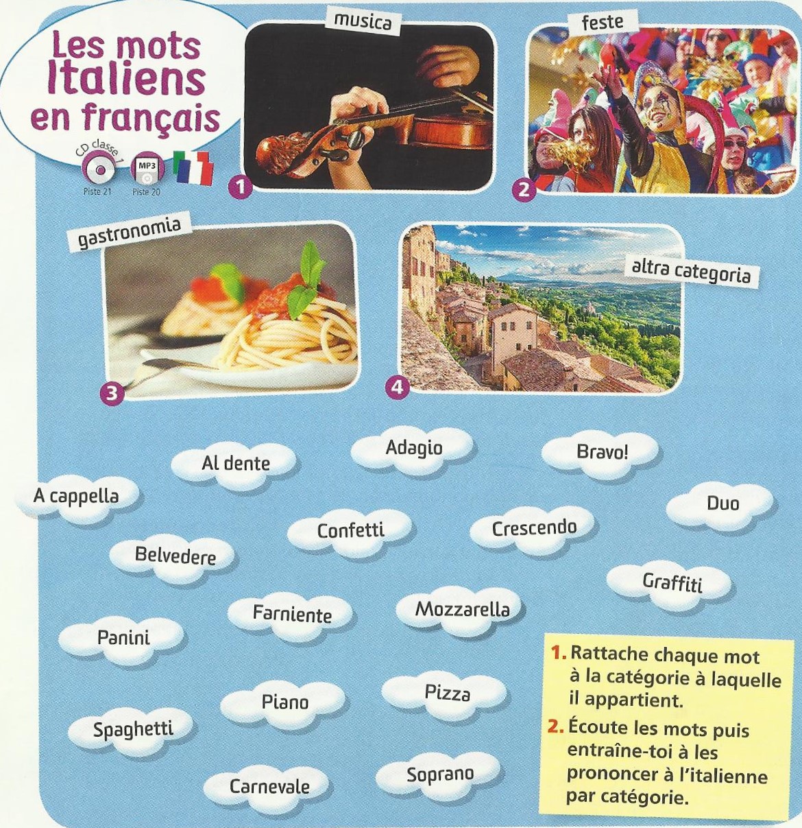 Ecoutez la prononciation italienne des mots proposés avec le fichier audio en pièce jointe.