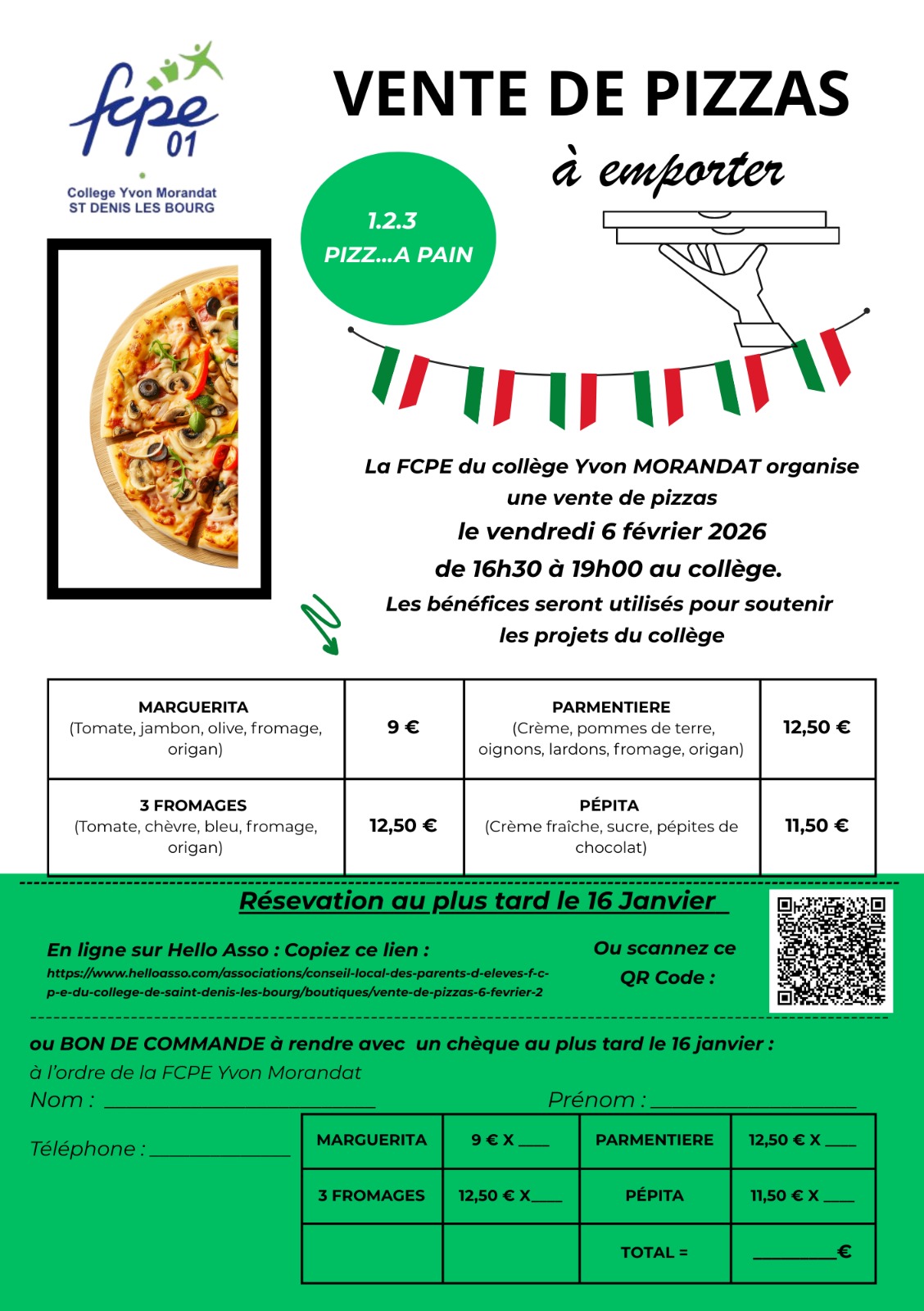 Le Conseil Local de la FCPE du collège organise une vente de pizzas en partenariat avec 123 pizz...a pain.